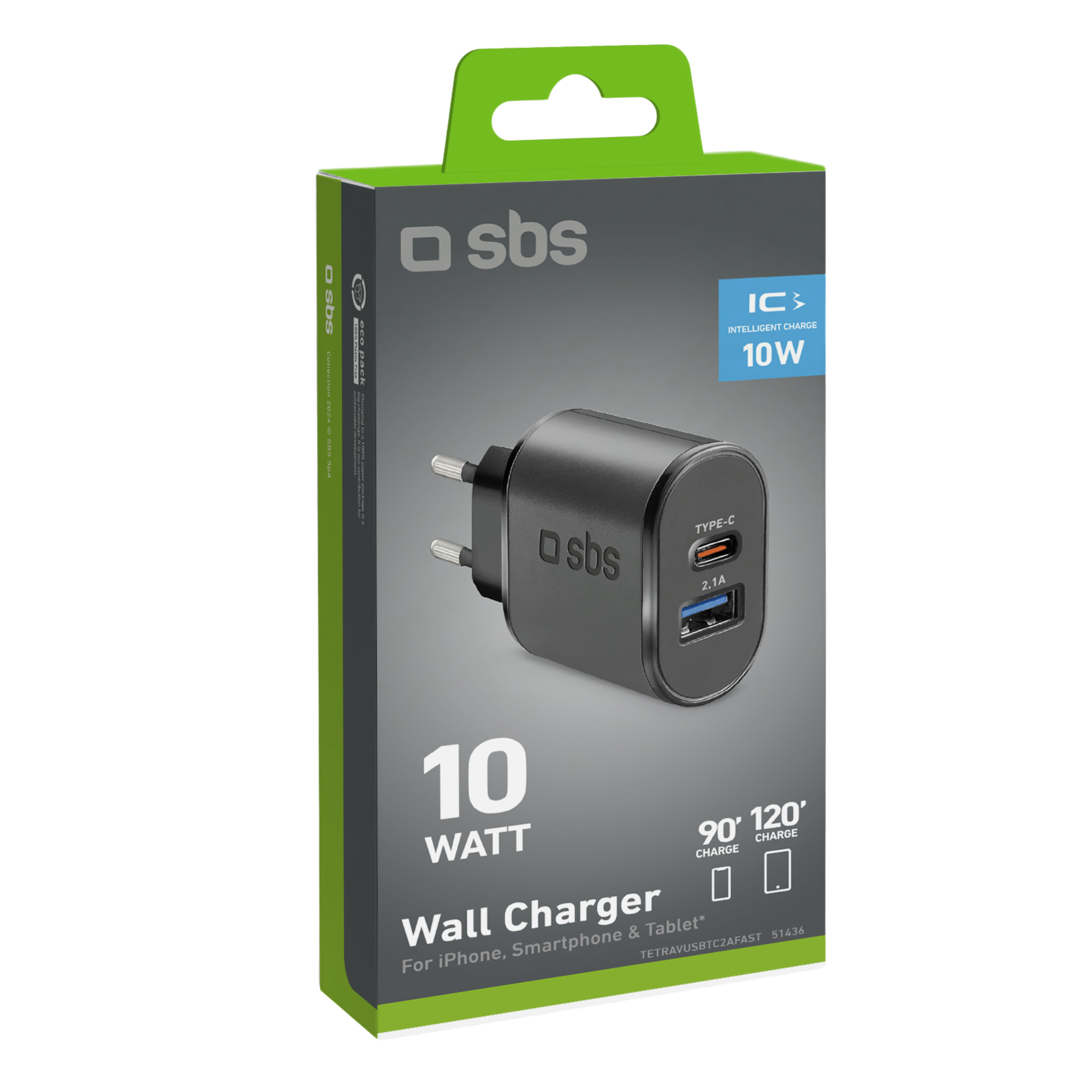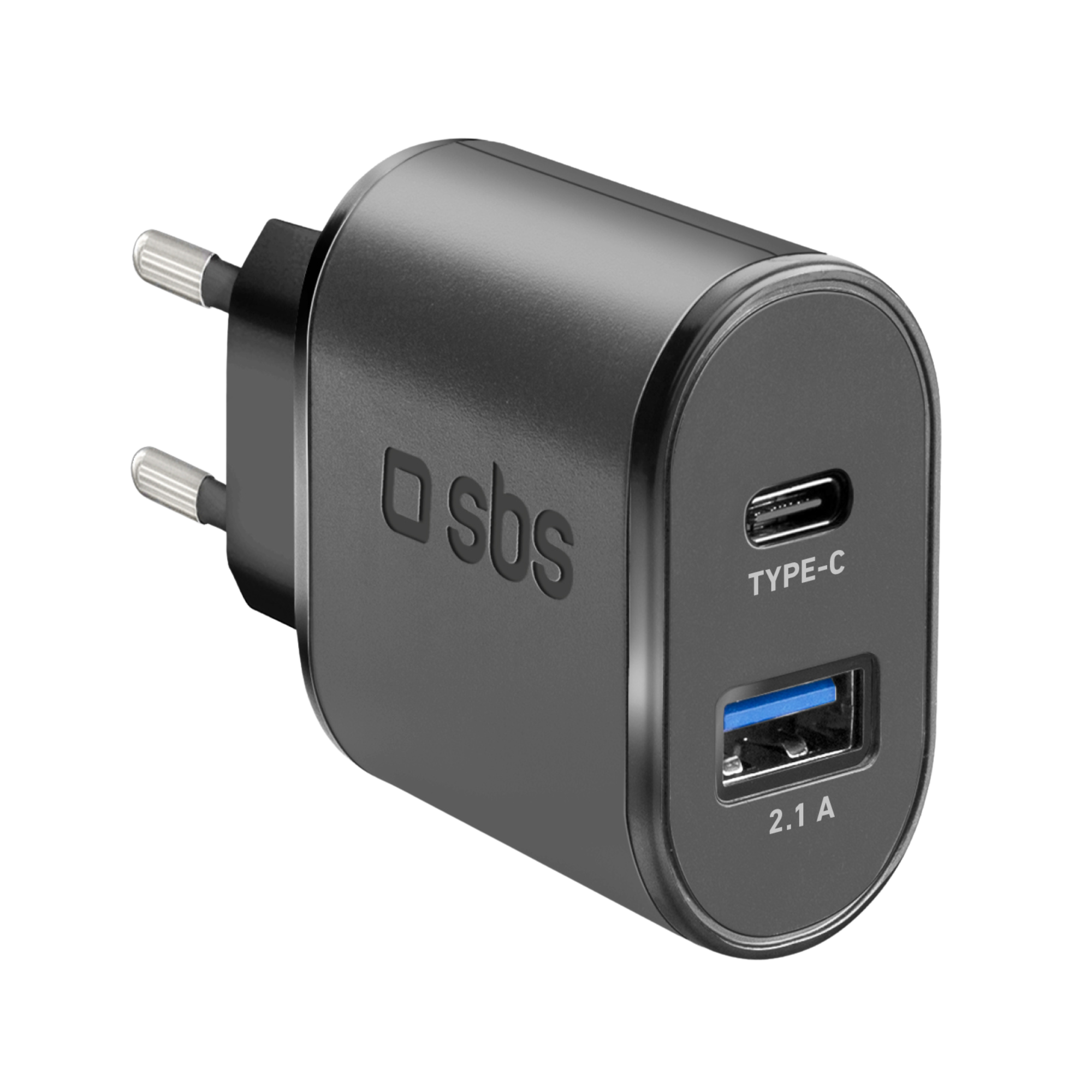 Travel charger with USB and Type-C 2.1A outputs, Intelligent Charge and European plug