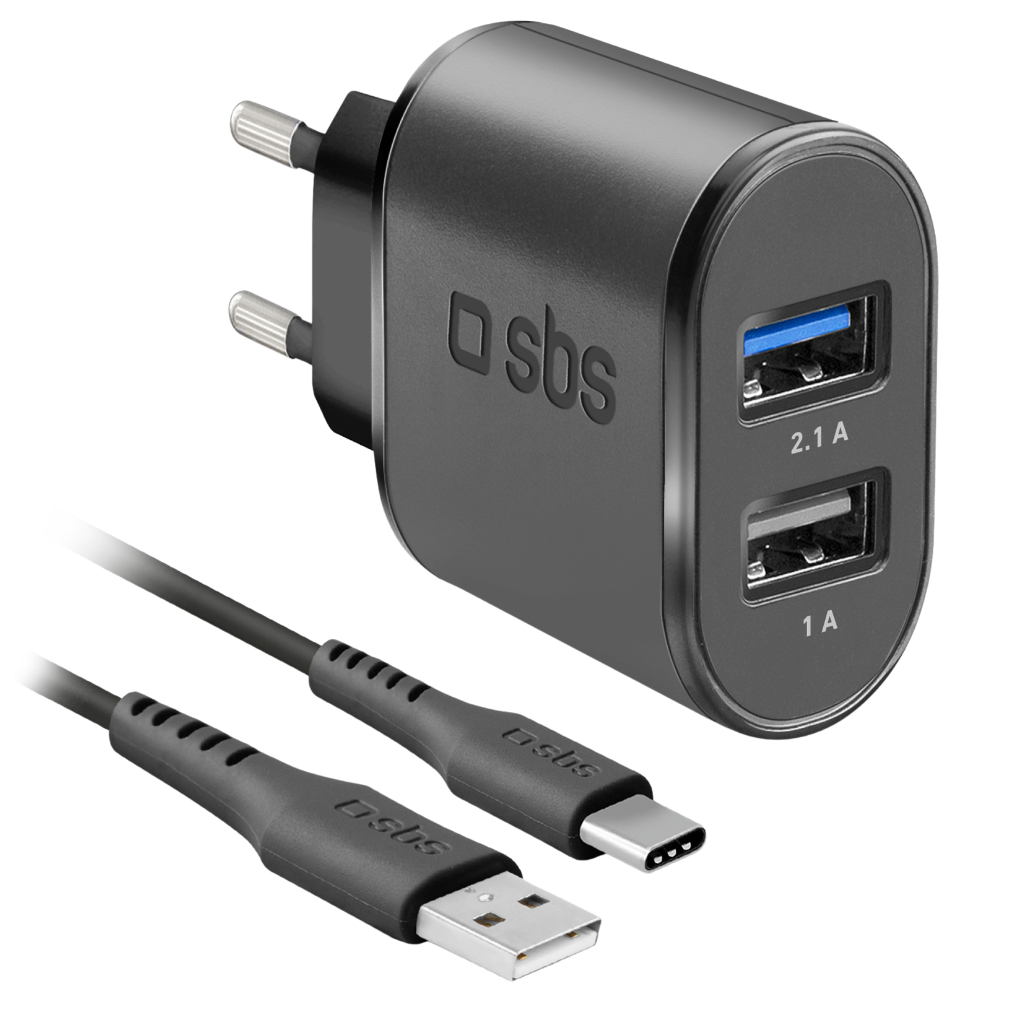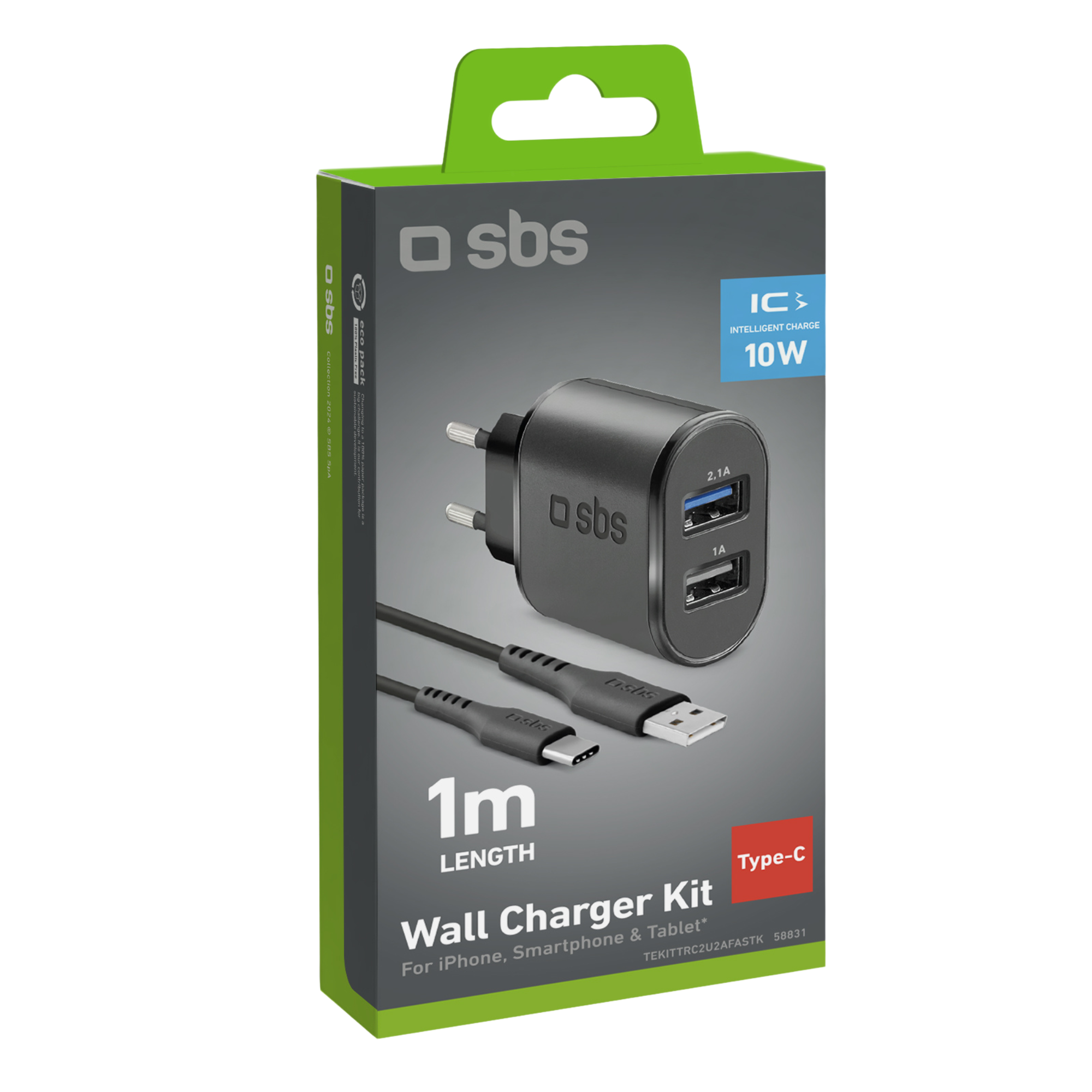 Wall charger with two USB outputs (1A and 2.1A with Intelligent Charge technology) and charging cable with USB and Type-C connectors